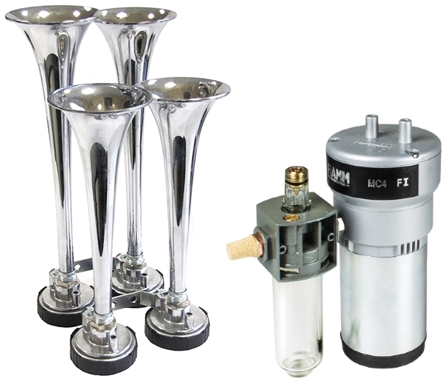 Die MC4-Kompressoranlage von FIAMM vereint kompakte Einbaumaße mit einem kraftvollen, tremolierenden Signalton bei einem erstaunlich günstigen Anschaffungspreis (verglichen mit anderen Herstellern). Der Kompressor kann mit seinen kompakten Abmessungen einfach verbaut werden, ein Daueröler ist bereits dabei. Die verchromten Membranhörner sind paarweise bereits auf einem Montagehalter befestigt, auch Schneeschutzkappen sind standardmäßig inklusive.