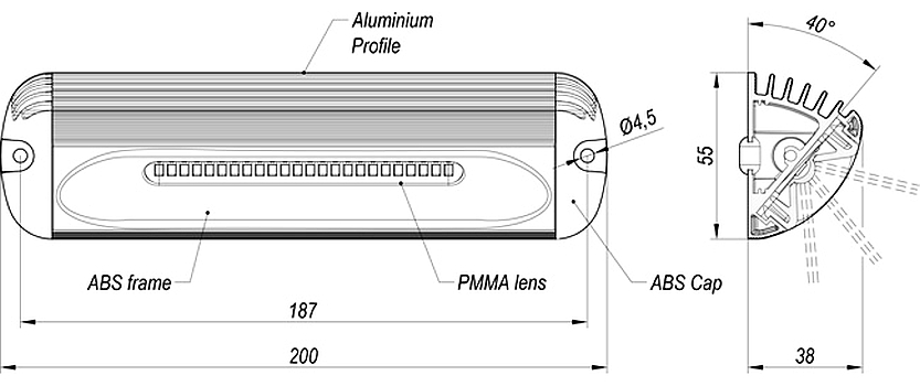 Die SCENELUX ist eine äußerst stabile und lichtstarke LED Umfeldleuchte mit einem attraktiven Preis-/Leistungsverhältnis. Sie eignet sich für zahlreiche Anwendungen wie die Montage als Umfeldleuchte an Einsatzfahrzeugen, Wohnmobilen, LKW, Transportern, als Innenleuchte im Geräteraum, als Rückfahrleuchte am hinteren Querträger, und viele weitere Möglichkeiten! 24 SMD-LEDs hinter einer Speziallinse aus PMMA sorgen für eine homogene Lichtverteilung und einen horizontalen Abstrahlwinkel von ca. 80°. Das robuste Alugehäuse sorgt für die notwendige Wärmeabfuhr. Wird die Leuchte an einer komplett vertikalen Fläche befestigt, so beginnt der Lichtstrahl bereits direkt am Fahrzeug. Hierdurch wird ein Aussteigen aus dem Fahrzeug in widrigen Umgebungen erheblich sicherer. Die Montage erfolgt unkompliziert durch zwei Schrauben, welche anschließend durch zwei Abdeckkappen versteckt werden.