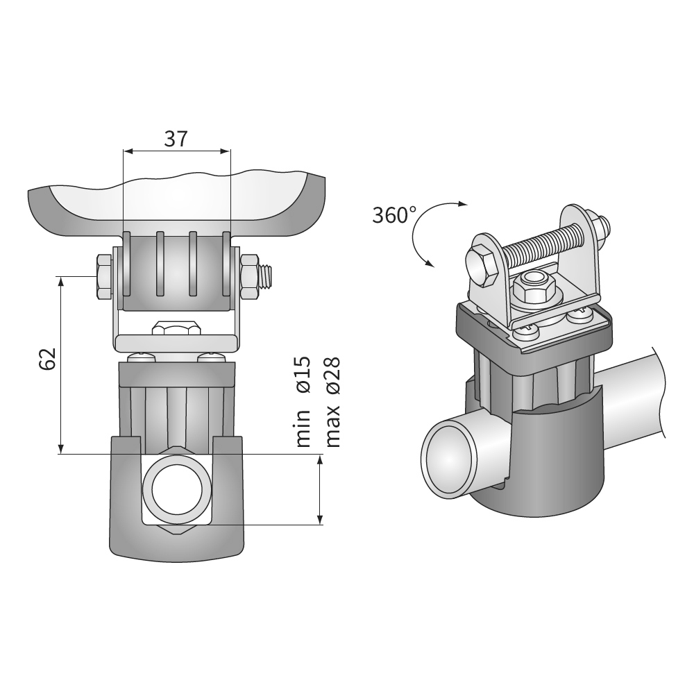 Mit dieser Klemme können Scheinwerfer an Rohren oder Spiegelarmen einfach und ohne Bohren befestigt werden. Die verstellbare Halterung ist geeignet für Durchmesser von 15 bis 28 mm. Der Montagewinkel für den Scheinwerfer besitzt eine Innenweite von 35 mm - falls diese jedoch nicht mit dem Scheinwerfer kompatibel ist, kann der Bügel einfach abgenommen werden und durch den Originalen des Scheinwerfers ersetzt werden. Der Winkel selbst kann frei um 360° geschwenkt werden. Alle Metallteile sind aus rostfreiem Edelstahl gefertigt.