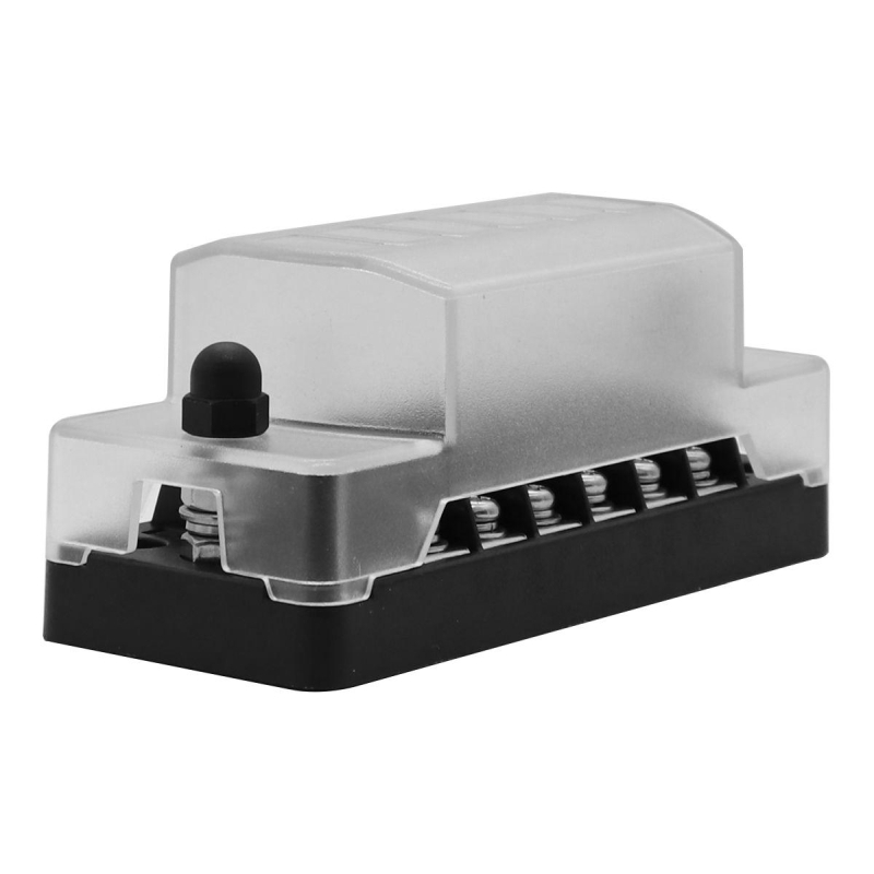 Die Masseausgänge sind alle direkt mit dem Masseeingang verbunden, die Plusausgänge laufen jeweils über die entsprechende Sicherung. Der transparente Deckel schützt die Sicherungen vor Staub und Beschädigungen, klare Sichtfenster dienen zur Funktionskontrolle oder zum Aufbringen von Beschriftungen. Einfache Befestigung des Sicherungsverteilers durch vier Schrauben.