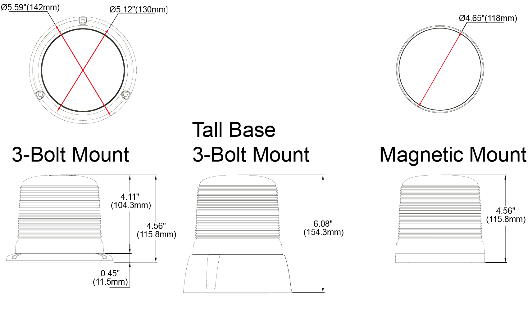 - Festmontage, B1 Lochkreis Ø 142 mm, H 115 mm - Festmontage hoher Sockel, B1 Lochkr. Ø 142 mm, H 154 mm - Magnetmontage Ø 118 mm, H 115 mm |