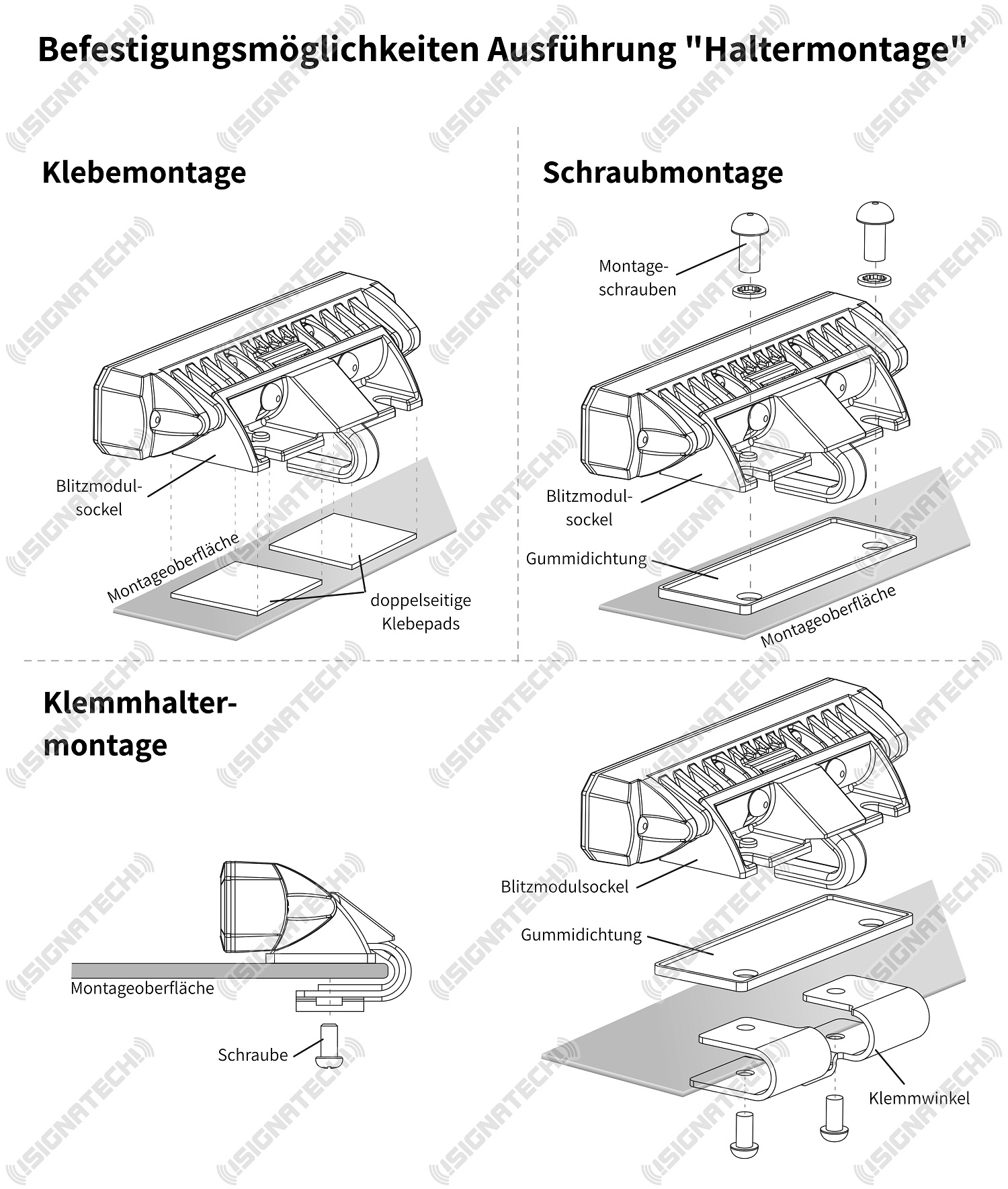 - Haltermontage: für die Montage an horizontalen Flächen, oder z.B. an den Rippen des Kühlergrills, an Leuchtenträgern, hinten am Dach auf Kastenwägen, etc. Der Winkel des Blitzmoduls kann nach oben und unten etwas verstellt werden. Drei verschiedene Montagevarianten: Schraubmontage, Klebemontage, Klemmhaltermontage (siehe Bild 2)